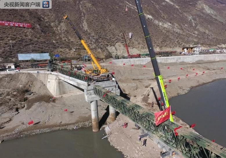 11月25日12時40分,經(jīng)過武警某部交通三支隊官兵連續(xù)晝夜奮戰(zhàn),被沖毀的金沙江大橋成功吊裝起第一跨,標(biāo)志著318國道搶通取得突破性進(jìn)展。