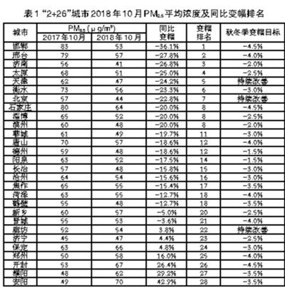 京津冀及周邊地區(qū)“2+26”城市2018年10月PM2.5濃度范圍為41-70微克/立方米(μg/m3),平均為54 μg/m3,同比下降11.5%。濃度最低的4個城市是濟南、北京、天津和濟寧(并列第3),分別為41 μg/m3、44 μg/m3、47 μg/m3、47 μg/m3;濃度最高的3個城市是安陽、開封和保定,分別為70 μg/m3、67 μg/m3和66 μg/m3。從改善幅度看,21個城市PM2.5平均濃度同比下降,其中20個城市PM2.5平均濃度降幅滿足秋冬季改善目標進度要求;降幅排名前3位的邯鄲、邢臺和濟南,同比分別下降36.1%、27.8%和26.8%。安陽、濮陽、開封、鄭州、保定、濟寧、廊坊等7個城市PM2.5濃度同比不降反升,其中安陽上升幅度最大,同比上升42.9%。
