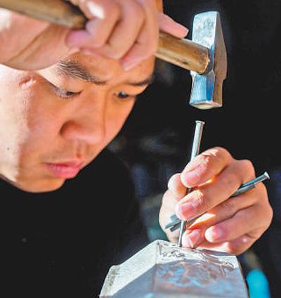 新華村位于云南省鳳凰山下,是茶馬古道上一個典型的白族聚居村。居民八成以上從事銀器等手工藝品加工制作,產(chǎn)品遠(yuǎn)銷海內(nèi)外。圖為一名工匠在加工工藝品。