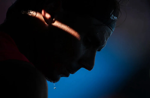 2020年1月25日,西班牙選手納達爾在澳大利亞墨爾本舉行的澳大利亞網(wǎng)球公開賽男子單打第三輪比賽中汗如雨下。新華社記者 白雪飛 攝