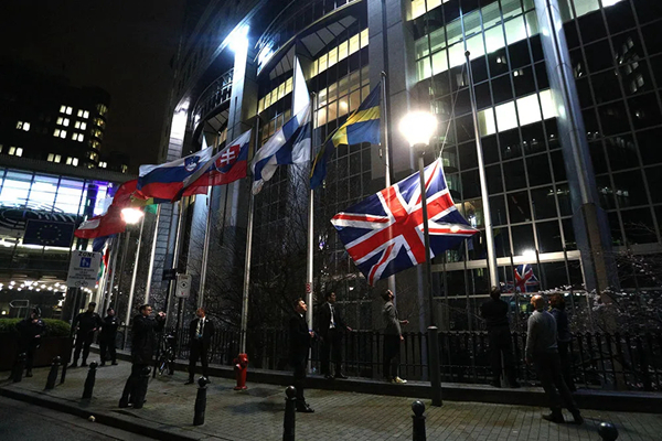 2020年1月31日,在比利時布魯塞爾的歐洲議會外,工作人員降下英國國旗。布魯塞爾當?shù)貢r間1月31日24時(英國時間1月31日23時),英國正式脫離歐盟。新華社記者 鄭煥松 攝