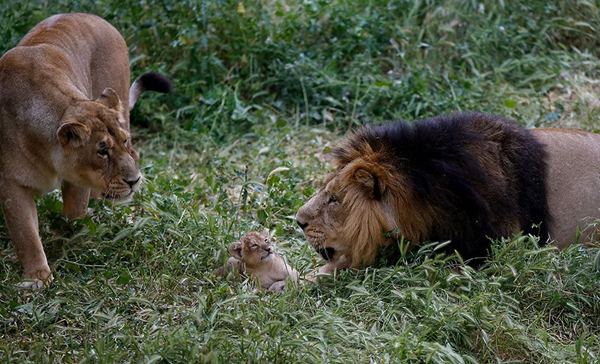 2020年5月7日,在耶路撒冷的動物園內(nèi),一只亞洲獅寶寶和父母在一起。新華社發(fā)(吉爾·科恩·馬根攝)