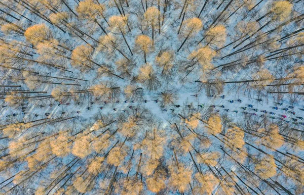 2020年1月4日,參賽選手在2020中國長春凈月潭瓦薩國際滑雪節(jié)暨2020國際雪聯(lián)越野滑雪中國巡回賽長春站比賽中(無人機照片)。新華社記者 許暢 攝