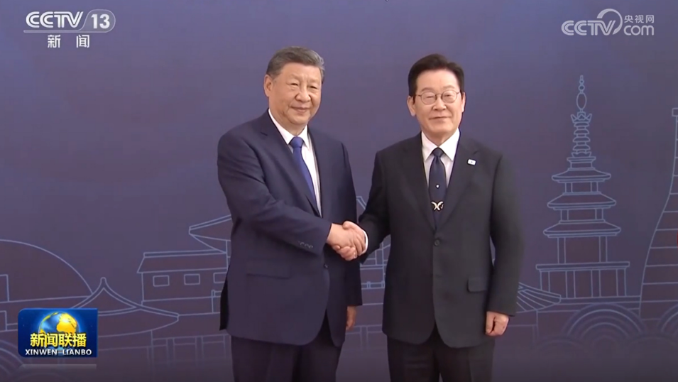 李在明熱情迎接習(xí)近平。兩國(guó)元首握手合影。