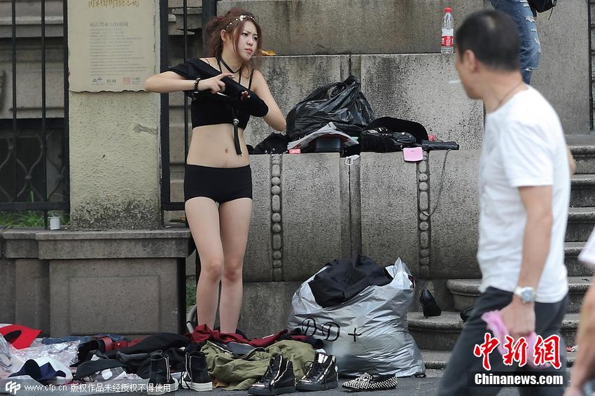 2015年9月4日,杭州中山中路一幢西式建筑外,幾名模特在街頭為網店拍攝秋冬服裝新品,為節(jié)省換裝時間,模特們淡定當街脫掉衣服,只剩內衣內褲,迅速換上另一套服……