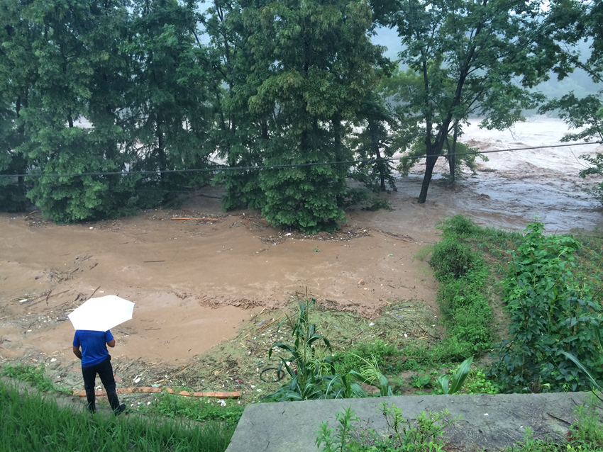 昨日下午2時許,南鄭縣牟家壩鎮(zhèn)公路邊一村子,近百米寬的冷水河,水面距離公路不足1米高。一村民正忙著將水邊的木板向家里挪,他說,水面至少已升了三四米,再升就上公路了。