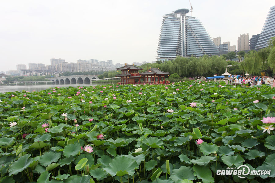 曲江池荷花爭(zhēng)相開放 端莊美麗引游人