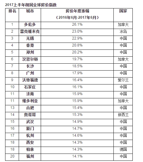 該報告中的房價變化對比的是2017年6月與2016年6月這12個月以來的數(shù)據(jù)。除了無錫排在全球第3位以外,香港排在第4位,鄭州排在第5位,長沙排在第7位,廣州第8位,石家莊第10位,濟南第11位,合肥第13位,武漢第15位,廈門第16位,杭州第17位,西安排在第18位。
