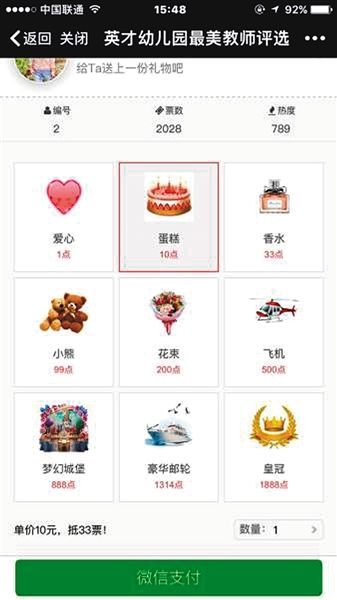 “除了投票外,還能送禮物,而禮物有一點(diǎn)愛心、10點(diǎn)蛋糕、500點(diǎn)飛機(jī)和1888點(diǎn)皇冠等9個(gè)種類。”李先生說,這些禮物都是需要花錢購(gòu)買的,1點(diǎn)就是1元,并且所抵的票數(shù)與點(diǎn)數(shù)多少成正比,一點(diǎn)愛心可抵3票,而1888點(diǎn)的皇冠則可抵8000票!拔抑唤o老師投了一票,沒有購(gòu)買禮物!崩钕壬f,他覺得花錢買禮物給老師增加投票讓這個(gè)評(píng)選活動(dòng)變了味。