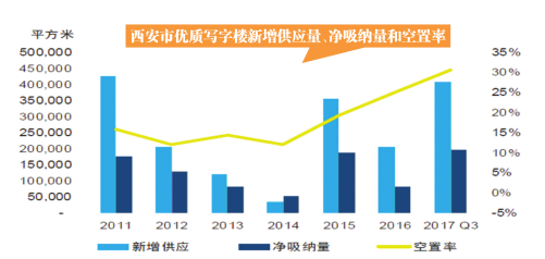 11月2日,房地產(chǎn)服務(wù)運營商戴德梁行發(fā)布今年第三季度市場報告顯示,隨著邁科中心等寫字樓入市,市場增加19.1萬平方米的優(yōu)質(zhì)寫字樓面積,全市甲級寫字樓總存量接近195萬平方米;全市凈吸納量累計值為85021平方米,其中高新區(qū)凈吸納量最高,為62110平方米。由于新項目入市,整體市場空置率升至30.58%,較上季度上升2.68個百分點。目前,西安寫字樓多集中于城市主干道沿線,同時,新入市的寫字樓品質(zhì)均較高,進(jìn)一步提升城市寫字樓的整體水平。