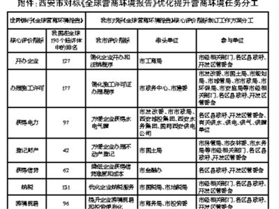 按照《西安市對(duì)標(biāo)〈全球營(yíng)商環(huán)境報(bào)告〉優(yōu)化提升營(yíng)商環(huán)境任務(wù)分工》(見(jiàn)附件),各牽頭部門(mén)根據(jù)各自職責(zé),從世界銀行《全球營(yíng)商環(huán)境報(bào)告》中開(kāi)辦企業(yè)、辦理施工許可、獲得電力、登記財(cái)產(chǎn)、獲得信貸、納稅、跨境貿(mào)易7個(gè)核心評(píng)價(jià)指標(biāo)入手,圍繞減環(huán)節(jié)、優(yōu)流程、壓時(shí)限、提效率,牽頭制訂具體工作方案,于2017年10月31日前報(bào)市行革辦研究審定后組織實(shí)施。市統(tǒng)計(jì)局會(huì)同市行政學(xué)院盡快研究制訂我市縣域營(yíng)商環(huán)境監(jiān)測(cè)評(píng)價(jià)指標(biāo),強(qiáng)化綜合衡量和定期排名,努力提升全市縣域營(yíng)商環(huán)境和市場(chǎng)競(jìng)爭(zhēng)力。