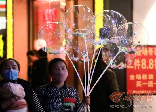 據(jù)了解,這種發(fā)光氣球由透明氣球、五彩LED燈帶和電池組成,有兩種形式,一種是塑料管連接五彩LED燈帶,另一種沒有塑料管,但是氣球可以飄起來,五彩燈帶隨氣球飄浮,在夜空中非常漂亮。一名攤販告訴華商報(bào)記者,他們是從批發(fā)市場(chǎng)批發(fā)了透明氣球、帶電池的五彩LED燈帶后,給透明氣球充上氫氣或者氦氣,將燈帶用透明膠帶固定在氣球上,打開開關(guān),透明氣球就變成了發(fā)光氣球。