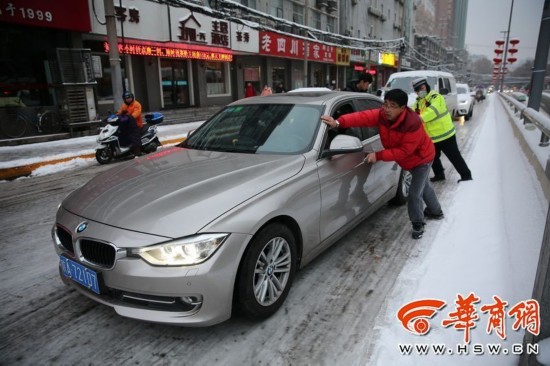1月4日在西安市咸寧路上,雪后路面太滑,紅燈停下后,寶馬車打滑都無(wú)法起步。 華商記者 鄧小衛(wèi) 攝影報(bào)道