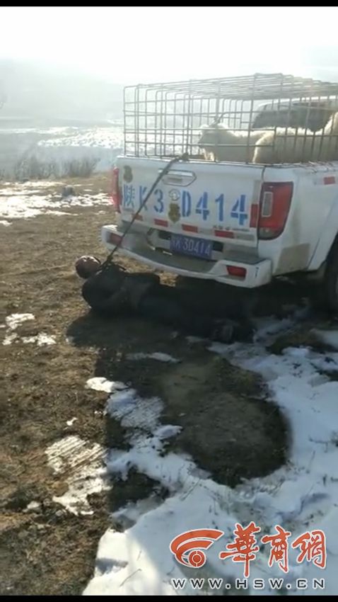 近日,一段視頻在榆林傳播,視頻中,3名年輕男子各抓著一只羊,一輛車(chē)牌照為陜K3D×××的執(zhí)法車(chē)停在一旁,車(chē)后的防護(hù)網(wǎng)中關(guān)著幾只羊,車(chē)尾有一男子平躺在地,一條繩索一頭套在他的脖子上,另一頭系在車(chē)的防護(hù)網(wǎng)上,車(chē)旁還有一名婦女跪在地上求請(qǐng)。婦女稱(chēng),草都在山溝里……他們實(shí)在沒(méi)辦法才這樣,有辦法的話就圈養(yǎng)起來(lái)喂了……