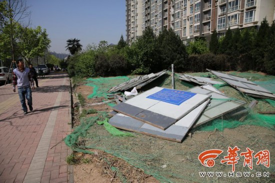 4月9日上午,華商報(bào)記者在小區(qū)正門東側(cè)綠化帶看到,有一片地已被平整出來,施劃了白線。根據(jù)圍擋上的“工程概況”,施工單位受雁塔區(qū)城管局委托,準(zhǔn)備在這里建設(shè)“渡塵閣公廁工程”,工期為90天。
