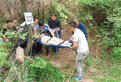 民警和眾人用擔(dān)架抬著楊某下山 通訊員 馬秀珍 攝