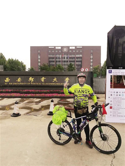 為了中秋節(jié)與家人團(tuán)聚,63歲的王長寶從遼寧丹東騎自行車抵達(dá)西安。 記者 趙麗莉 攝