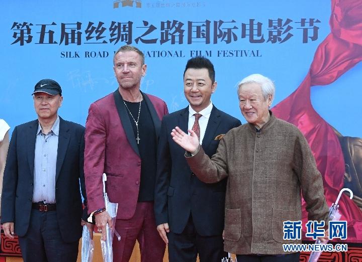 10月13日,第五屆絲綢之路國際電影節(jié)評(píng)委會(huì)成員謝飛、郭濤、雷尼·哈林、霍廷霄(從右至左)亮相紅毯。新華社記者 張博文 攝