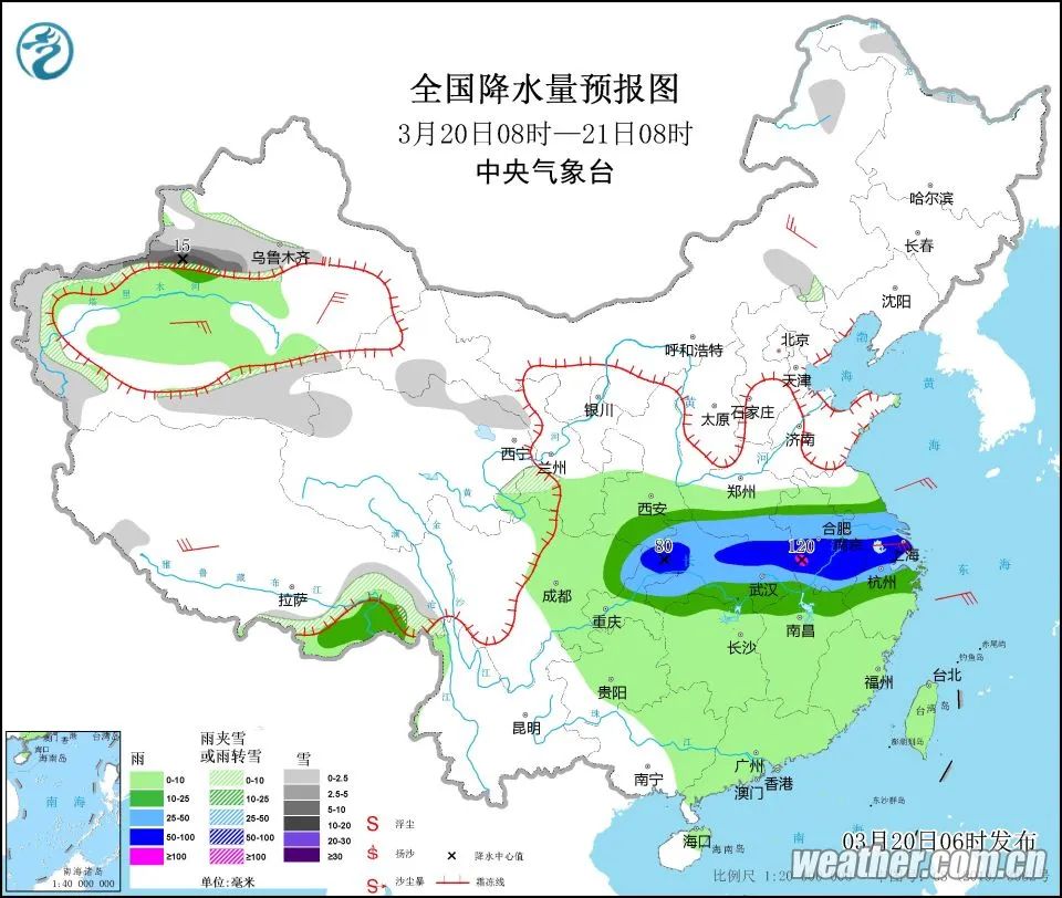 預(yù)計(jì),3月20日08時(shí)至21日08時(shí),四川盆地東北部、陜西東南部、湖北、河南南部、安徽中南部、江蘇南部、上海、浙江北部等地有大雨,其中,重慶北部、陜西東南部、湖北北部和東部、河南東南部、安徽中部和西南部、江蘇南部、上海、浙江北部等地部分地區(qū)有暴雨,局地有大暴雨(100~120毫米),上述部分地區(qū)伴有短時(shí)強(qiáng)降水(最大小時(shí)降雨量20~40毫米,局地可超過(guò)50毫米),局地有雷暴大風(fēng)或冰雹等強(qiáng)對(duì)流天氣。