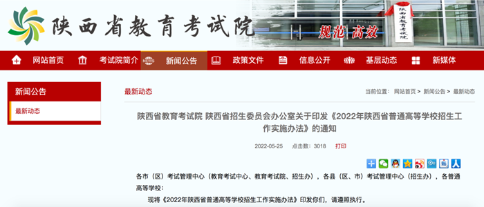 5月25日,陜西省教育考試院、陜西省招生委員會(huì)辦公室印發(fā)了《2022年陜西省普通高等學(xué)校招生工作實(shí)施辦法》,明確了陜西2022年高考考試、評(píng)卷、志愿填報(bào)招生錄取等政策。