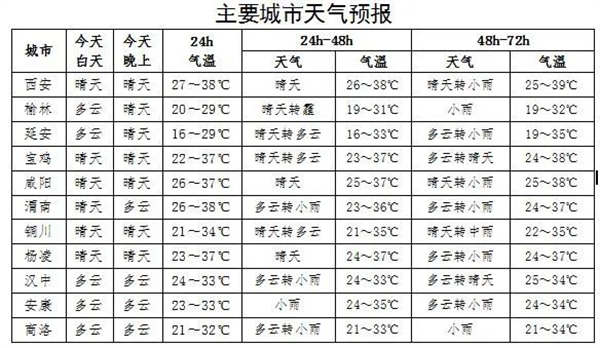 6日:全省多云間晴天。陜北部分地方、關(guān)中盆地大部分地方、陜南漢江沿線部分地方有35-37℃的高溫天氣,關(guān)中南部部分地方38-40℃、局地可達(dá)41-43℃以上。