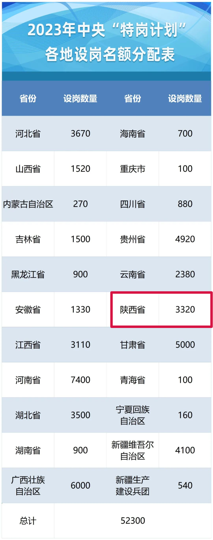 為深入貫徹黨的二十大精神,進(jìn)一步落實(shí)《中共中央 國(guó)務(wù)院關(guān)于全面深化新時(shí)代教師隊(duì)伍建設(shè)改革的意見(jiàn)》,加強(qiáng)新時(shí)代教師隊(duì)伍建設(shè),實(shí)現(xiàn)鞏固拓展脫貧攻堅(jiān)成果同鄉(xiāng)村振興有效銜接,教育部、財(cái)政部近日聯(lián)合印發(fā)《關(guān)于做好2023年農(nóng)村義務(wù)教育階段學(xué)校教師特設(shè)崗位計(jì)劃實(shí)施工作的通知》,全國(guó)計(jì)劃招聘特崗教師52300名,其中陜西招聘3320名。分配表如下→