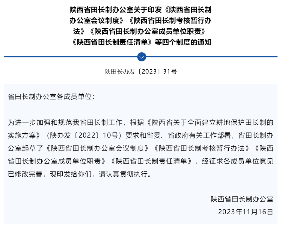 陜西省田長制辦公室印發(fā)通知公布四個制度