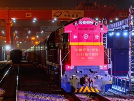 2024年元旦零點(diǎn)整,伴隨著悠揚(yáng)汽笛聲,中歐班列長安號(hào)2024年首趟班列從西安國際港站始發(fā)。班列55個(gè)集裝箱滿載紙塑鋁復(fù)合材料和百貨等,經(jīng)阿拉山口口岸出境,將最終抵達(dá)俄羅斯莫斯科,此次“跨國旅程”約7206公里,全程運(yùn)行13天。