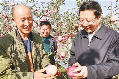 薛占海(右)在寶塔區(qū)棗園街道辦廟溝村幫果農(nóng)朱懷明算蘋果銷售賬。 本報記者 龔仕建攝 一見到陜西金風(fēng)科技有限公司負(fù)責(zé)人李超,延安市長薛占海就急切地問:“你……