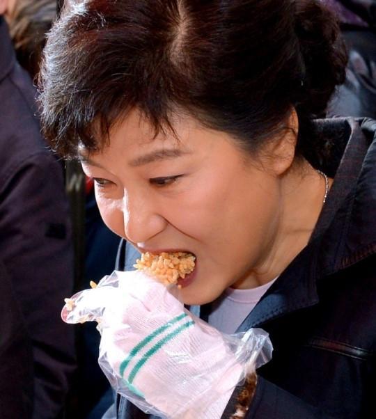 2012年11月,總統(tǒng)候選人樸槿惠現(xiàn)身傳統(tǒng)市場,購買糕點并品嘗。
