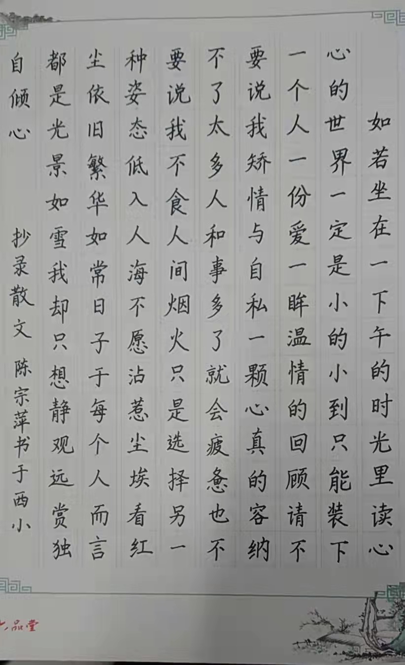 本次教師基本功大賽比賽內(nèi)容為“三筆一畫”,即硬筆字、粉筆字、毛筆字和簡筆畫。其中硬筆書寫內(nèi)容為教育方針,粉筆和毛筆書寫內(nèi)容為古詩《靜夜思》,簡筆畫內(nèi)容不限,自行創(chuàng)作。比賽現(xiàn)場(chǎng),老師們聚精會(huì)神地書寫,專心致志的繪畫,墨香蕩漾著整個(gè)校園。鋼筆的一筆一畫中規(guī)中矩,結(jié)構(gòu)和諧,彰顯字如其人的道理;板書則美觀大方,橫豎撇捺折,筆鋒掠過,一股明麗清新之氣撲人眉宇;簡筆畫勾畫了了,像簡明、得體、通俗的語言,傳達(dá)著富有感染力的情愫。