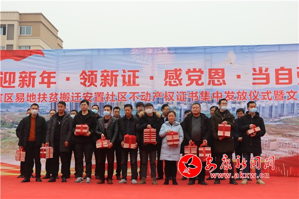 本網(wǎng)訊(通訊員 唐海龍 王林)“迎新年、領新證,感黨恩、當自強。”歌舞歡騰、喜氣洋洋的漢濱區(qū)建民辦長嶺社區(qū)活動廣場上,搬遷戶張善武拿著鮮紅的不動產(chǎn)權證書激動地說:“領到新本本,心里一下踏實多了,日子更有盼頭了!”。
