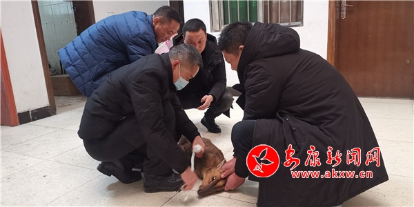 接到報告后,大竹園鎮(zhèn)派出所、農綜站、綜合執(zhí)法辦公室三部門聯(lián)合出動,迅速趕往現(xiàn)場,通過現(xiàn)場比對鑒定,發(fā)現(xiàn)這只小動物是國家二級野生保護動物麂子。為穩(wěn)定麂子傷情,工作人員現(xiàn)場進行了傷口處理,并將其帶回鎮(zhèn)農綜站邀請獸醫(yī)進行診治。