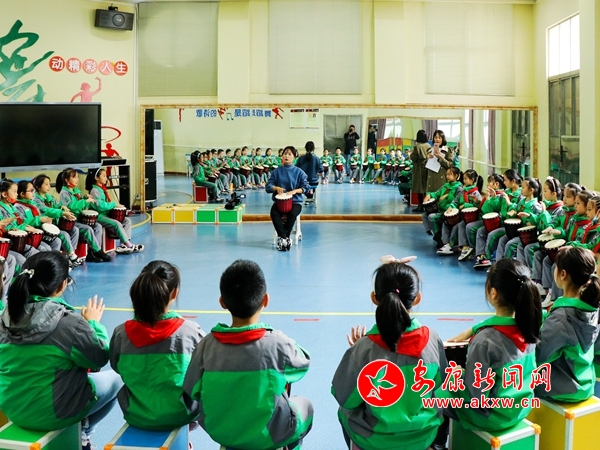 “同學(xué)們好,經(jīng)過前面的學(xué)習(xí),大家已經(jīng)熟練地掌握了非洲鼓低音和中音的打法,今天我們一起來學(xué)習(xí)高音的打法,打高音時手指自然張開,但不要張的很大,在打擊時要······”10月14日下午16:20,漢濱區(qū)果園小學(xué)非洲鼓社團(tuán)汪倩老師正在教學(xué)生非洲鼓演奏,孩子們熱情專注地拍打,富有節(jié)奏感的鼓聲飄蕩在校園上空。這是該校落實(shí)“5+2”模式素質(zhì)拓展服務(wù)的一個縮影。