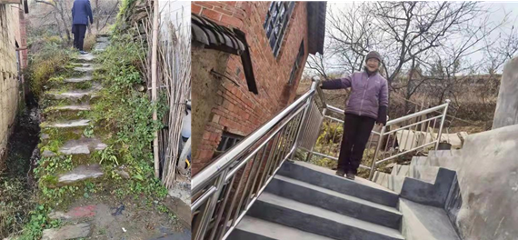 由于鄧大芝老人年事已高,門前土石坎年久失修、坡陡路滑,“出門是陡坎、雨雪出行難”,成了她“急難愁盼”的心頭事。2021年10月,在黨史學習教育中,安康農(nóng)商銀行深入幫扶的沈壩鎮(zhèn)富田村問需求、聽訴求,為群眾解難事、辦實事,了解到這一情況后,總行領導立即帶領設計施工人員現(xiàn)場辦公,制定修繕方案,撥付專項費用,加快修繕進度,徹底解決老人出行不便問題,并對院壩、廚房一并進行維修,改善居住生活條件,并定期上門看望慰問。