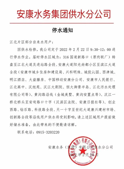本網(wǎng)訊 2月20日,據(jù)市水務(wù)集團(tuán)公司消息,因供水檢修,2月22日9:30至12:00江北片區(qū)將進(jìn)行停水作業(yè),屆時(shí)用戶供水將受到影響請(qǐng)?zhí)崆白龊脙?chǔ)水準(zhǔn)備。68K安康新聞網(wǎng)