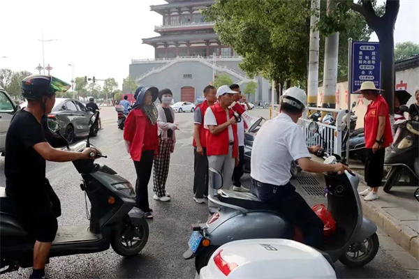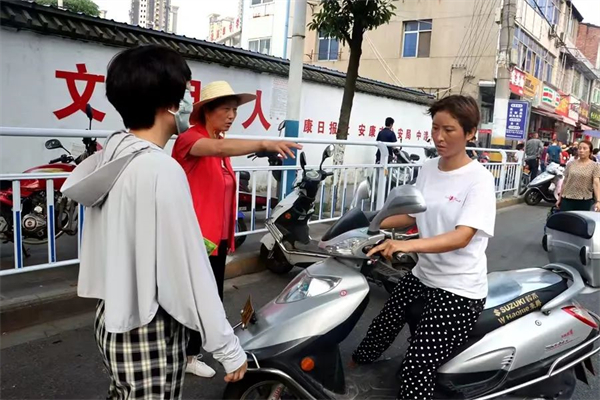 “騎電動車一定要戴頭盔,不能亂停亂放,要停在劃線區(qū)域內(nèi),交通規(guī)則必須遵守,謝謝配合。”