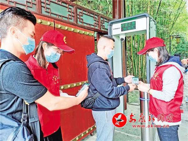“您好,歡迎來(lái)到漢濱區(qū)香溪洞風(fēng)景區(qū)游玩,請(qǐng)您佩戴好口罩,手機(jī)掃一掃入園場(chǎng)地碼,有序測(cè)量體溫進(jìn)入景區(qū)游玩。”9月28日,漢濱區(qū)的青年志愿者身著紅馬甲,為游客做好溫馨提示和疫情防控安全指引。國(guó)慶即將來(lái)臨,我市各大景區(qū)游客絡(luò)繹不絕,青年志愿者深入各景區(qū)景點(diǎn),規(guī)勸亂刻亂畫、亂扔垃圾等不文明行為,同時(shí)做好疫情防控安全提示,成為景區(qū)一道亮麗的“紅色風(fēng)景線”。陳榮斌 攝