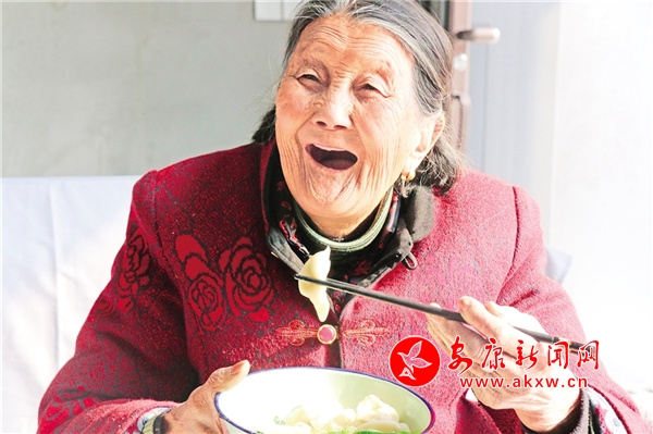 李增富前腳剛進(jìn)門,我們也隨著他走進(jìn)屋,接過兒子遞過來的飯碗,母親一口一口慢慢吃著餃子,“這餃子香,我一次能吃十幾個(gè)呢。”雖然耳朵聽不清,但是老人對食堂的飯菜贊賞有加。