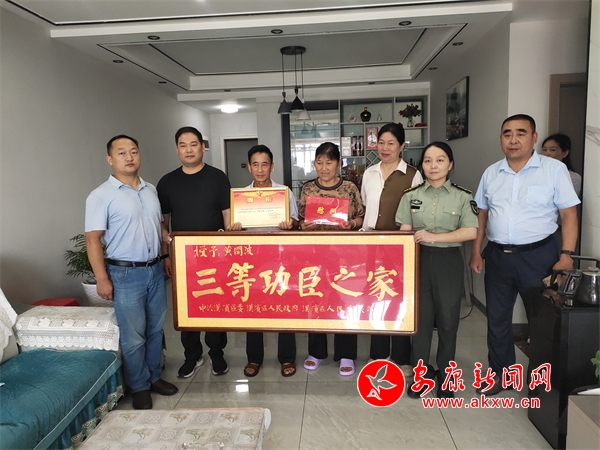 “感謝你們?yōu)閲澜ㄔO(shè)的大力支持和默默付出,也感謝你們?yōu)椴筷犈囵B(yǎng)了一名優(yōu)秀的士兵,一人立功、全家光榮,希望你們繼續(xù)做好兒子的堅強后盾,讓孩子在部隊再立新功。”在現(xiàn)役軍人黃開波的家里,鎮(zhèn)領(lǐng)導把一面“三等功之家”的牌匾送到黃開波的父親黃朝德的手里時動情地說。