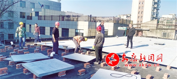 工人正在對安康日報(bào)社家屬樓房頂進(jìn)行處理