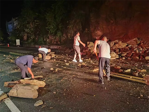 “G211省道,陽坡村9組瀛湖加油站對面山體發(fā)生嚴(yán)重塌方,大量落石滾落堆積在主干道路上,嚴(yán)重危及來往車輛行車安全。”7月18日凌晨1:58分,一道尖銳的手機鈴聲將陽坡村黨支部書記晏真云從睡夢中驚醒,在得到消息后,陽坡村四支隊伍迅速集結(jié),帶著鐵鍬、手套等工具第一時間沖向塌方路段,對落石及淤泥進行清理搬運。