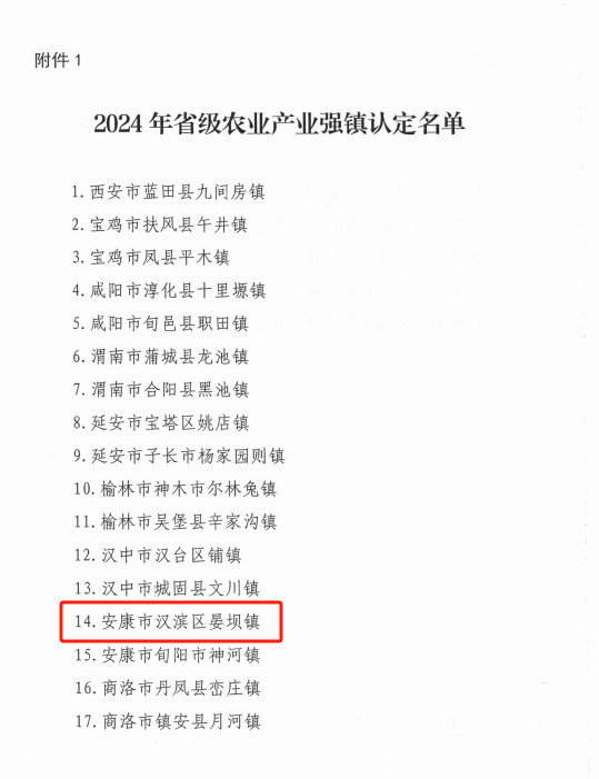 3月4日,陜西省農(nóng)業(yè)農(nóng)村廳公布2024年省級農(nóng)業(yè)產(chǎn)業(yè)強(qiáng)鎮(zhèn)認(rèn)定名單。其中我市漢濱區(qū)晏壩鎮(zhèn)名列其中。 tPb安康新聞網(wǎng)