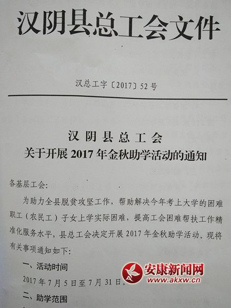 安康新聞網(wǎng)訊(通訊員 儲毅)為助力全縣脫貧攻堅工作,幫助解決今年考上大學的困難職工(農(nóng)民工)子女上學實際困難,提高工會困難幫扶工作精準化服務水平。日前,漢陰縣總工會印發(fā)了《關(guān)于開展2017年金秋助學活動的通知》。