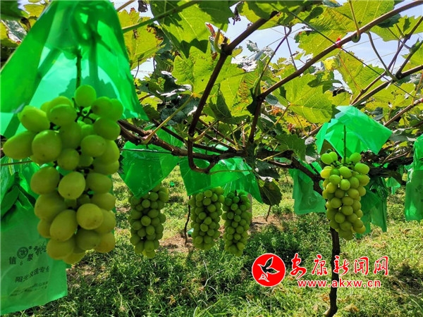 園子里20余畝葡萄在陽光的沐浴下早已熟透,串串掛滿枝頭,剝開紙袋,葡萄緊密飽滿,散發(fā)著誘人的果香,顆顆晶瑩剔透、碩大如棗,惹人喜愛。