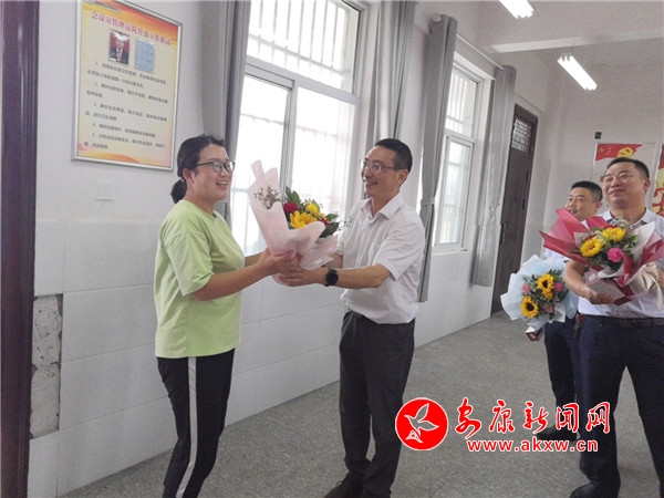 每到一所學(xué)校,校委會(huì)成員親手為教師們獻(xiàn)上鮮花、口杯等禮物,并與大家親切交談,詳細(xì)了解學(xué)校教學(xué)活動(dòng)開展情況和教師們的生活、工作情況,同時(shí)向辛勤耕耘,默默付出的教師們致以崇高的敬意和真摯的祝福。