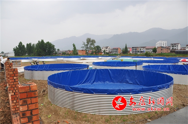在項目建設(shè)現(xiàn)場,60個直徑8米高1.5米的圓形水池已經(jīng)建好,一個個用鐵皮圍成的藍色圓桶很是顯眼。“這種水池外圈都是由不銹鋼圍成的,里面是用藍色防水布包裹。”劉光興指著水池說:“這個鄉(xiāng)村振興項目是陸基圓桶型高位養(yǎng)魚池,主要利用洞河水庫庫區(qū)下游優(yōu)質(zhì)水資源來養(yǎng)殖匙吻鱘、黃辣丁、鱸魚等中高端暢銷品種。采取的是循環(huán)水養(yǎng)魚新模式,優(yōu)勢是流水養(yǎng)魚、品質(zhì)好,還減少了人力和養(yǎng)殖成本,提高科學化管理水平。6月底前,就能建成使用。”YWh安康新聞網(wǎng)