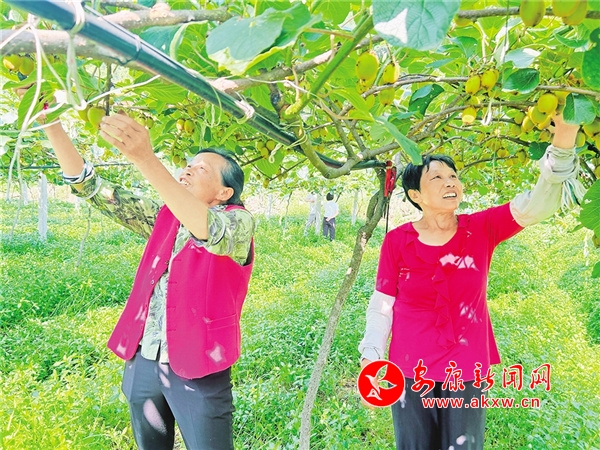 走進觀音河鎮(zhèn)水田村獼猴桃種植基地,放眼望去,片片綠葉下,一個個果型飽滿、大小勻稱的獼猴桃掛滿枝頭。陽光透過片片綠葉,照射在青黃色的果實上,清新的果香隨風(fēng)四溢。