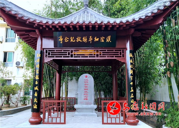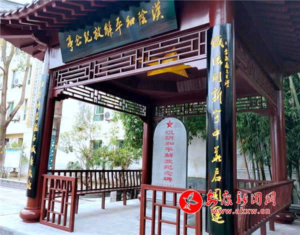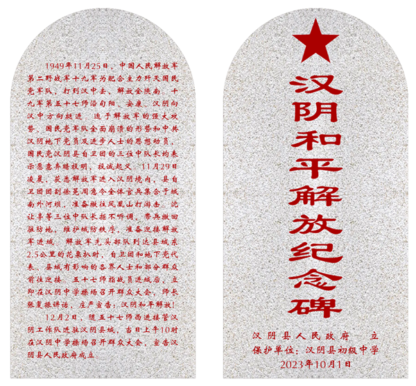 漢陰和平解放紀念碑、紀念亭矗立于漢陰縣初級中學(原漢陰中學所在地)操場東北角。紀念碑上“漢陰和平解放紀念碑”九個醒目的大字,承載著在中國共產(chǎn)黨的領(lǐng)導下,漢陰各族人民為爭取解放而進行英勇奮斗的光輝歷程。“鐵流開新宇中華啟國運,紅纓縛蒼龍古城喜民通。”和平解放紀念亭上的鎏金匾額則是由漢陰本土知名作家李泉森撰寫,知名書法家張正生所題寫。4WS安康新聞網(wǎng)