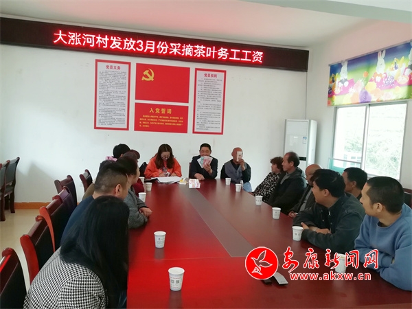 “第一名,二組李正國,15天4100元,第二名……”4月9日,在漢陰縣漩渦鎮(zhèn)大漲河村委會,大漲河茶葉專業(yè)合作社為村內(nèi)和周邊村的采茶工發(fā)放3月份采茶工資74066元,80多名茶農(nóng)領(lǐng)到了春后采茶的第一份工資。pEr安康新聞網(wǎng)